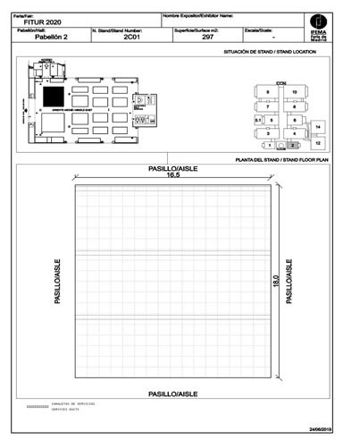 امسال غرفه جمهوری اسلامی ایران به مساحت 297 متر مربع به ابعاد 16.5 متر در18متر ، به صورت 4 طرف باز به شماره 2C01 در سالن شماره 2 محل دائمی برگزاری نمايشگاههای FIERA DE MADRID قرار دارد .