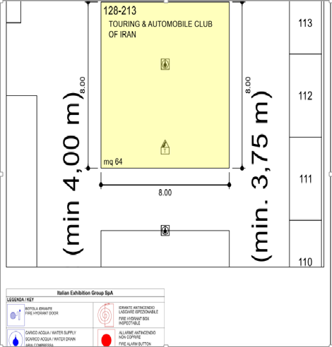 امسال غرفه جمهوری اسلامی ایران به مساحت 64 متر مربع به ابعاد 8 متر در8متر ، به صورت 4 طرف باز به شماره 213-128 در سالن شماره C3 در محل برگزاری نمايشگاههای RIMINI EXPO CENTER قرار دارد.