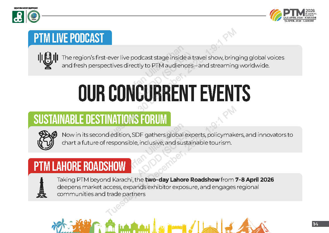 در نمایشگاه گردشگری پاکستان (PTM)، امکانات بیپایان است. به پلتفرم برتر جهانی سفر در جنوب آسیا قدم بگذارید و با ایجاد ارتباطات معنادار، ایجاد مشارکتهای استراتژیک و کاوش در مسیرهای جدید برای رشد، کسب و کار خود را تسریع کنید. PTM متخصصان سفر، سرمایهگذاران، سیاستگذاران و نوآوران را از سراسر جهان گرد هم میآورد تا بینشها، ایدهها و آخرین روندهای شکلدهنده آینده سفر را به اشتراک بگذارند. طی سه روز در کراچی - و ادامه آن با نمایشگاه جادهای لاهور - با رهبران صنعت تعامل خواهید داشت، نمایشگاههای فراگیر را تجربه خواهید کرد و راهحلهای نوآورانهای را کشف خواهید کرد که گردشگری را از نو تعریف میکنند.